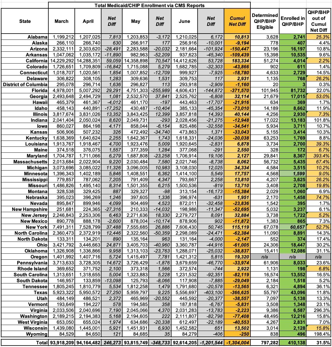 As you can see above, while cumulative net Medicaid/CHIP enrollment was indeed over 1.3 million lower in June vs. March, it was actually higher in 19 states: