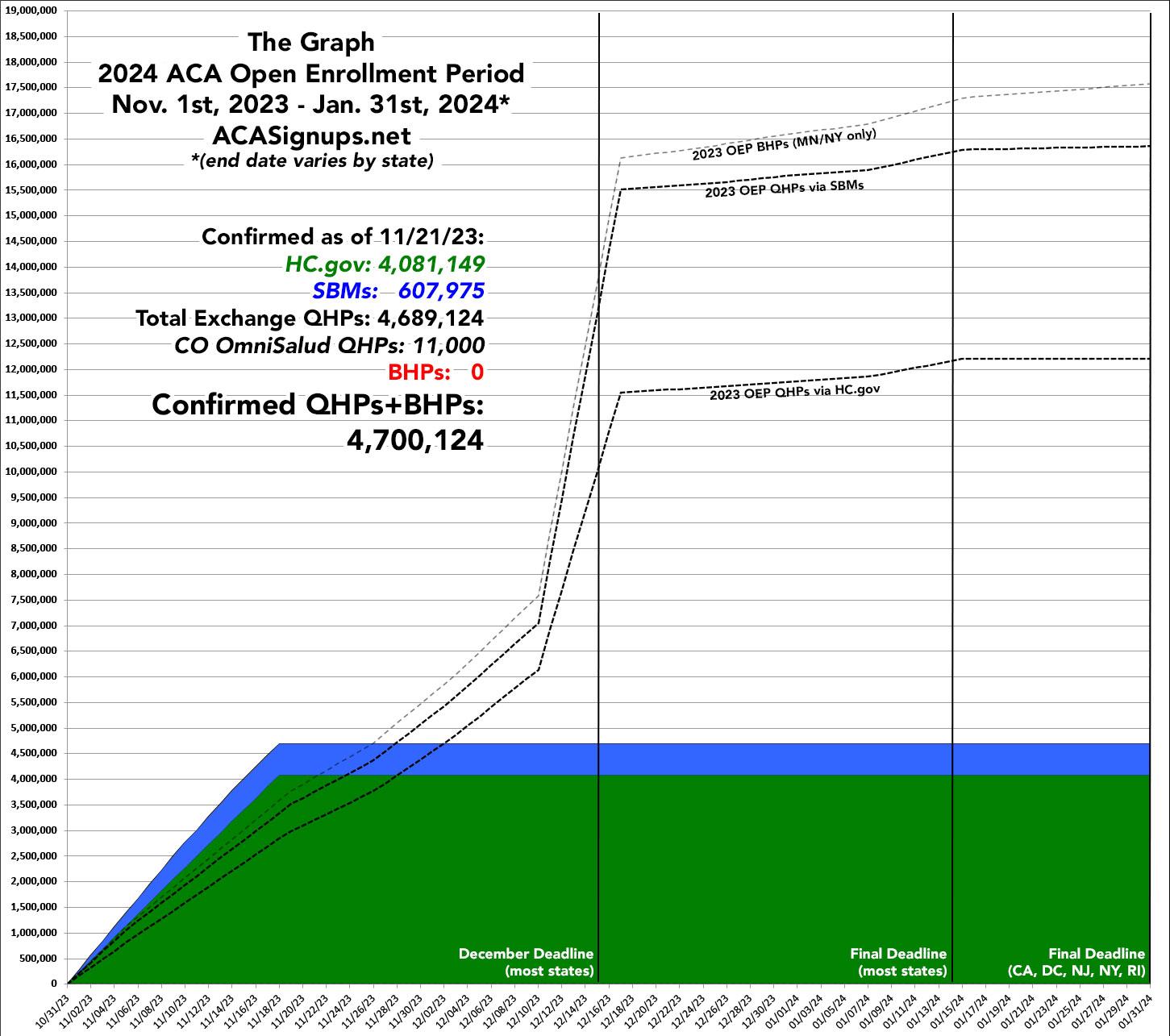 Put them all together and here's what it looks like visually, overlaid on top of the 2023 OEP enrollment progress. Eyeballing the graph below, it looks like we've likely broken 5.5 million QHP selections as of today (11/21):