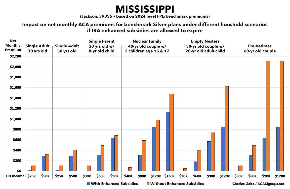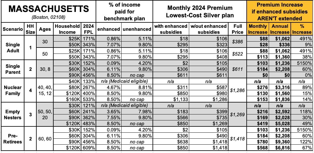 That's the macro level, however. As I did a couple of years ago when the subsidies were originally at risk of expiring in 2023, I decided to run the numbers myself to get an idea of just how much enrollees real-world health insurance premiums would go up in the event the ARPA/IRA subsidies are indeed allowed to expire at the end of next year.
