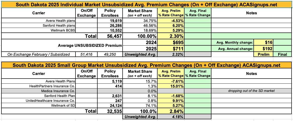 South Dakota: Preliminary avg. unsubsidized 2025 #ACA rate changes: +2.3%; Medica leaving sm. group market?