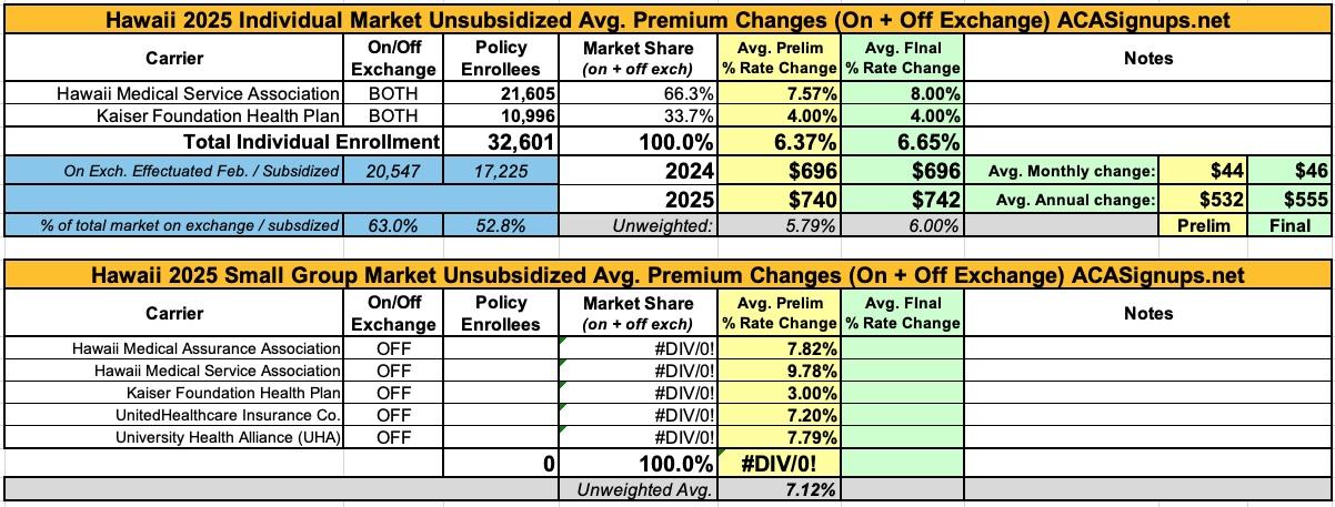 Hawaii: *Final* avg. unsubsidized 2025 #ACA rate changes: +6.7% (updated)