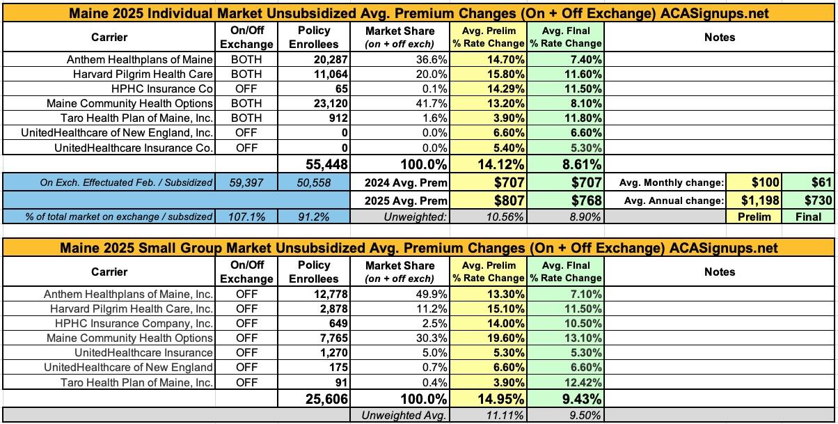 Maine: *Final* avg. unsubsidized 2025 #ACA rate changes: +8.6%