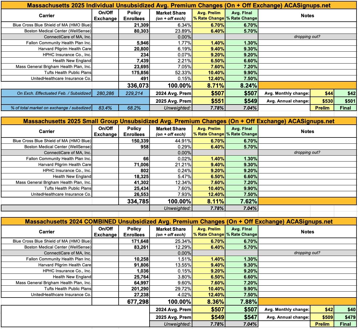 UPDATE 9/23/24: The Massachusetts Insurance Dept. has published the final, approved rates for 2025 for the indy/small group merged markets. There've only been a few changes which have reduced the overall weighted rate increase from 8.4% to 7.9%, although if you only include individual market enrollees it's a bit higher, at 8.2%.