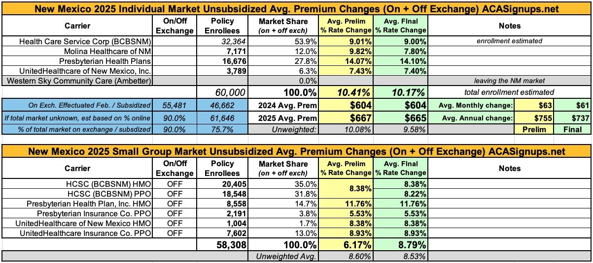 New Mexico: *Final* avg. unsubsidized 2025 #ACA rate changes: +10.2% (updated)