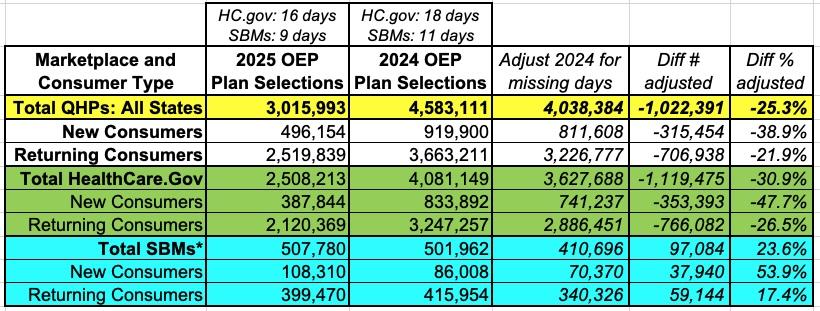 Huh? How could that be? From the initial numbers, it looks like the 2025 OEP is off to an ugly 34% drop in enrollments, even falling below the 2023 initial snapshot total of 3.35 million!