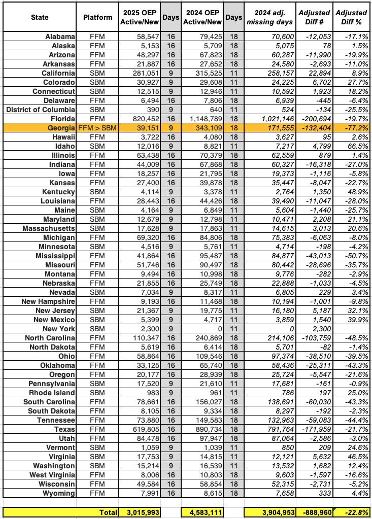 In addition, if you look only at 2025 FFM states (that is, not including Georgia in either year), active + new enrollments are still down 24.5% after adjusting for the 2 missing days.