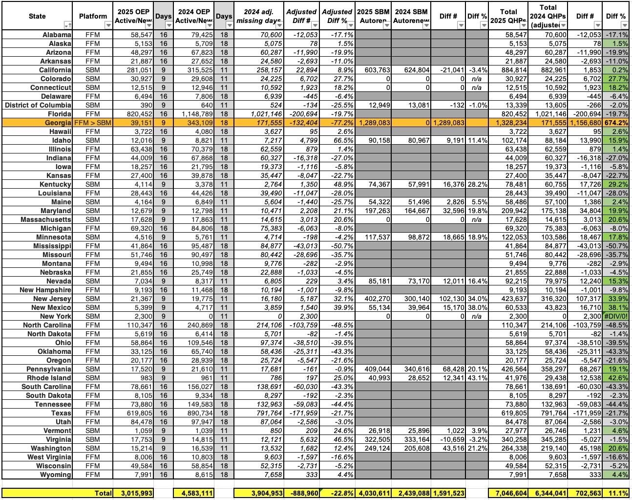 This is important for several reasons. The 2024 data above includes Georgia as an FFM state...but the 2025 data has it rightly listed as an SBM state. The problem is that unlike every other state which has to be adjusted from either 18 to 16 days or from 11 to 9 days...Georgia has to be adjusted from 18 days to 9 days!