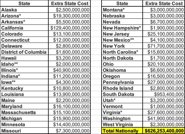 Well, according to this analysis by KFF, here's how much every expansion state (including the 12 w/trigger laws) would have to come up with on their own in order to fill in the $626 BILLION in lost federal funding if they wanted to keep their current expansion populations covered: