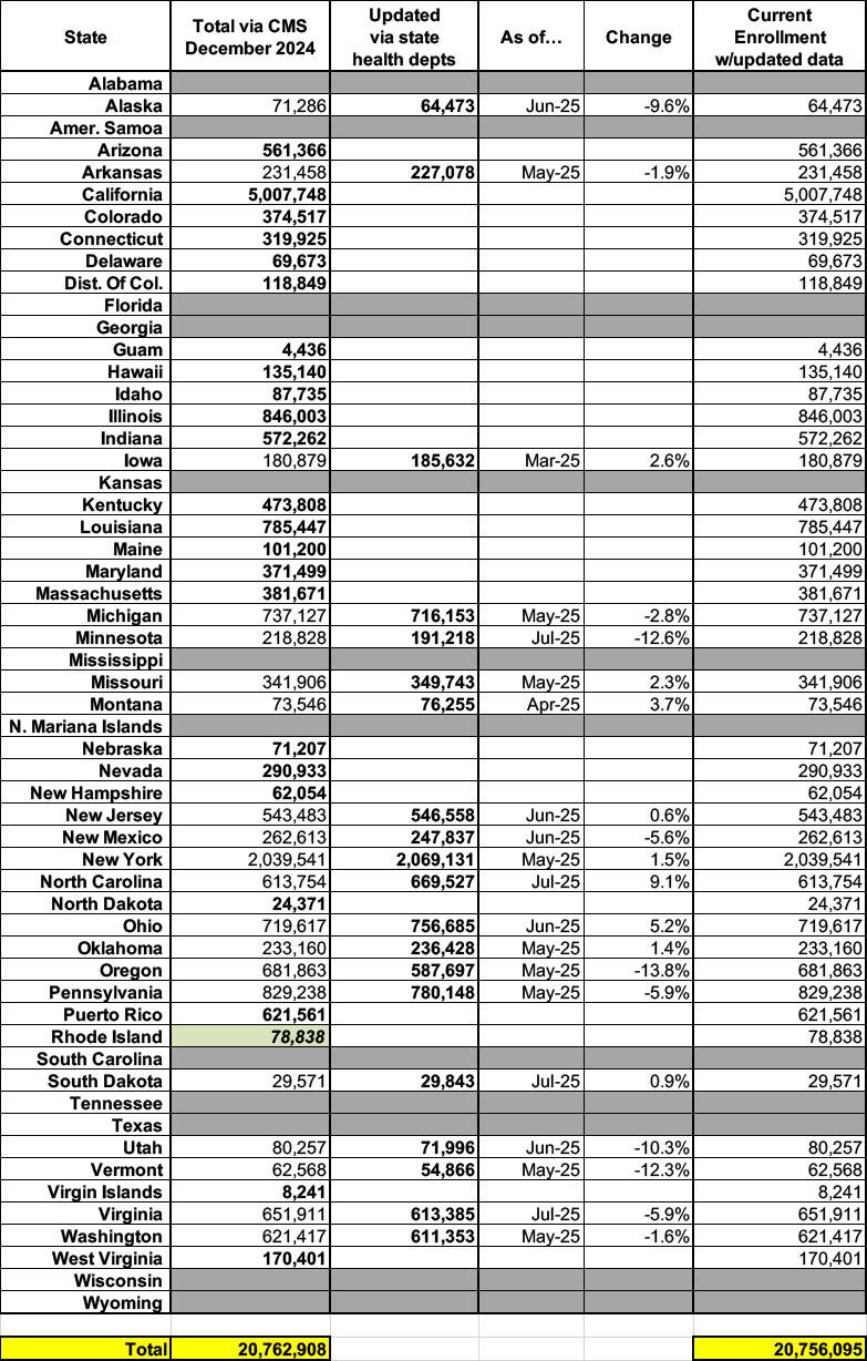 Note: CMS has Rhode Island down as "0" for the 4th quarter of 2024; this is due to their massive statewide system data breach from last winter. I've plugged in their official September 2024 enrollment figure for now.