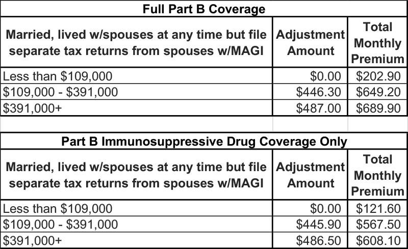 Premiums for high-income beneficiaries with full Part B coverage who are married and lived with their spouse at any time during the taxable year, but file a separate return, are as follows: