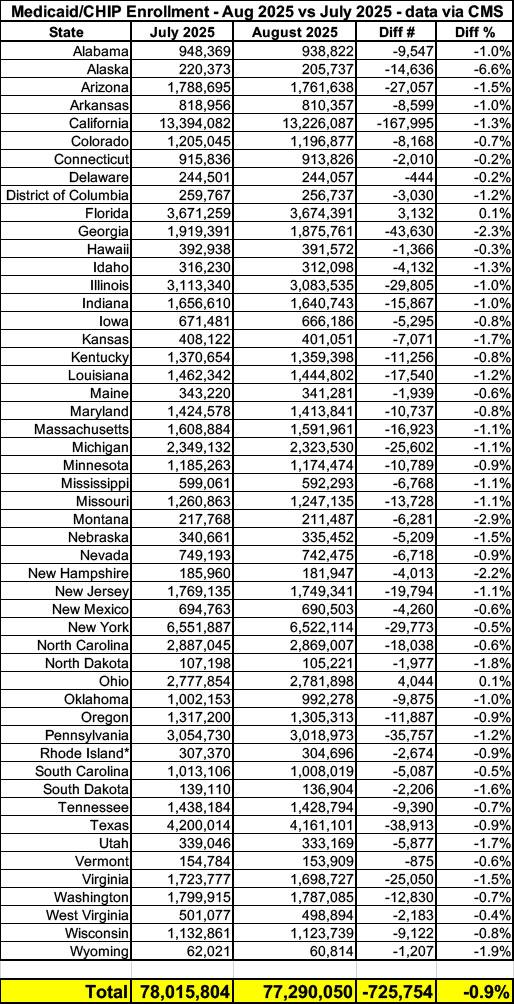 Total Medicaid/CHIP enrollment in August 2025 of ~77.3 million dropped about 0.9% from July 2025, or by around 725,000 people.