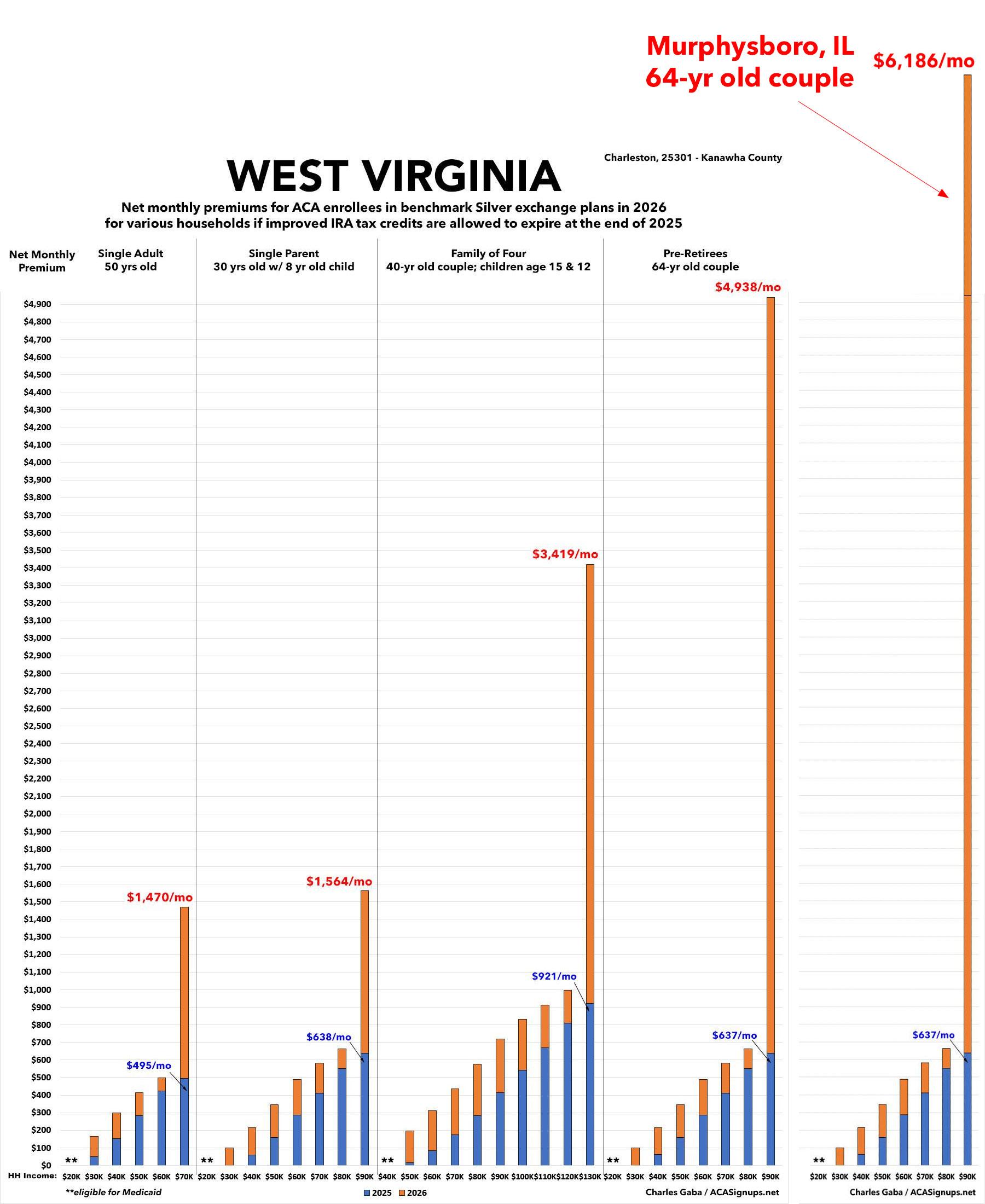 In putting together this project, the most extreme net rate hike example I was able to find was in Charleston, West Virginia, where a 64-yr old couple earning $90,000/year (426% FPL) would go from having to pay $637/month for the benchmark Silver plan in 2025 (8.5% of their gross income) to a whopping $4,938/month starting January 1st.