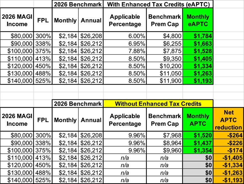 However, as noted above, the 2026 benchmark plan runs $2,184/month at full price...which means that IF the enhanced tax credits were to continue next year, we'd be eligible for anywhere from $1,193 - $1,784/month in federal assistance...