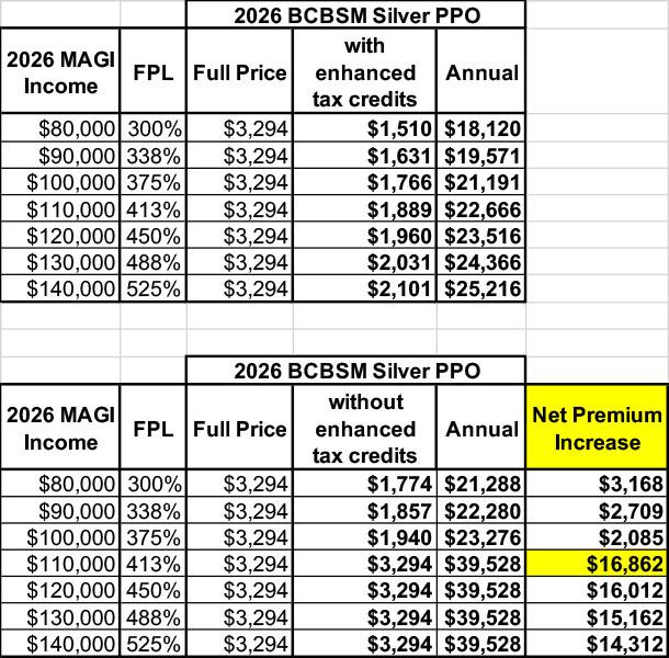 • If our 2026 MAGI income turns out to be more than 400% FPL, however (by even $1)...we're seriously screwed: Our net premiums skyrocket by an additional $14,000 - $17,000 for the year.