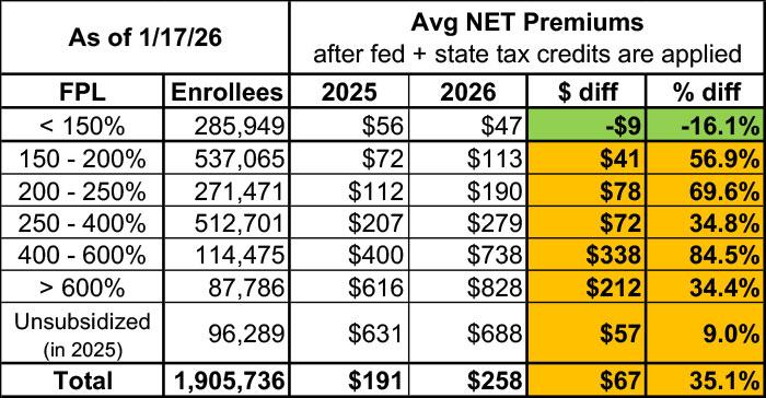 It's also worth noting that those state subsidies for the < 150% crowd came at a price: Most of the funds for it actually came from an existing program which wiped out subsidies for most enrollees the past few years, which means that in 2026...