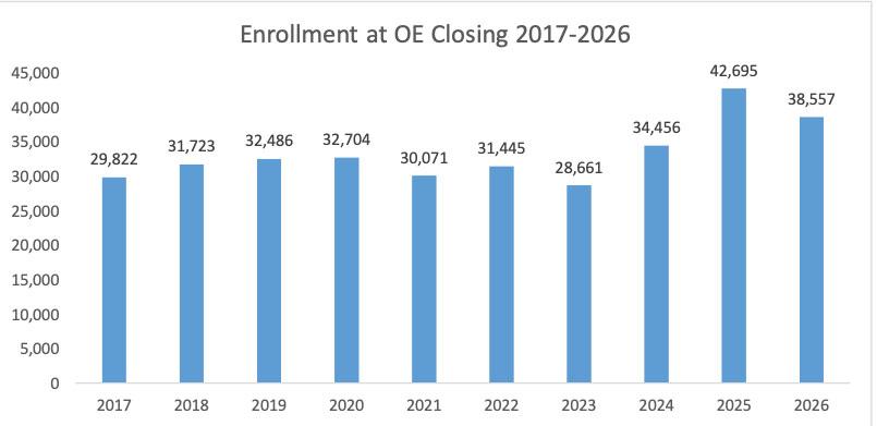 PROVIDENCE, RI – HealthSource RI (HSRI) concluded its annual Open Enrollment (OE) period January 31, with enrollment totals and the mix of plan selections bearing out expectations, as customers faced increased monthly costs upon the expiration of enhanced federal premium tax credits. Individual and Family enrollments totaled 38,557 during this Open Enrollment, a 10-percent decline from the record-high close of OE2025 (42,695). Overall enrollment decreased by 20% from year-end (48,060) to the end of OE, a highly unusual development, as the marketplace has recorded growth nearly every year in that same span.