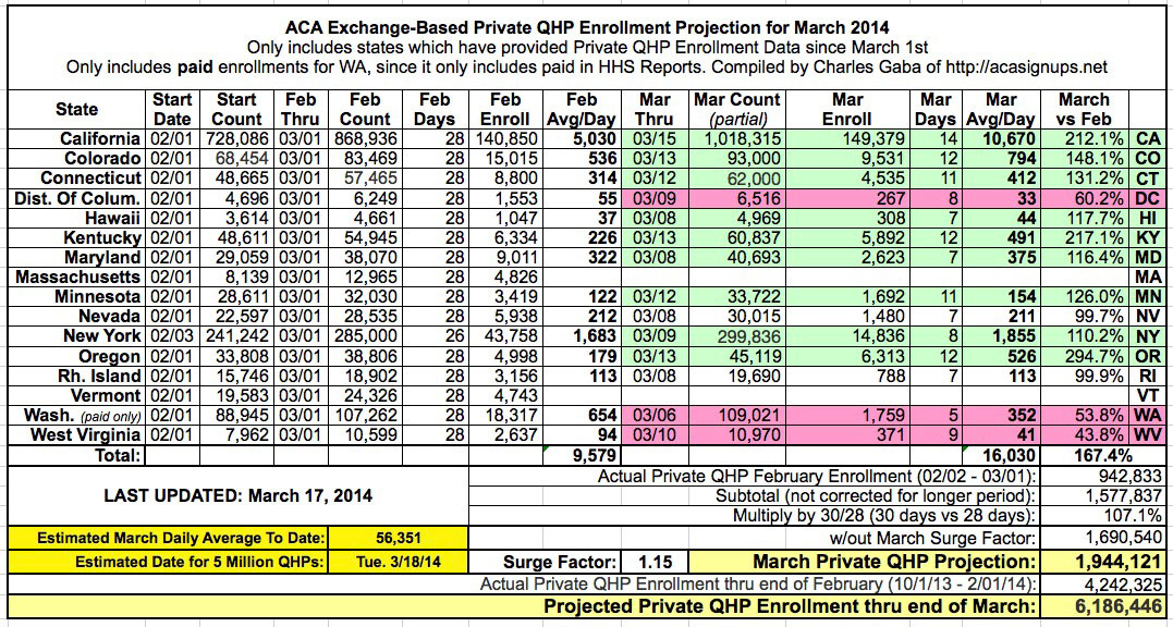 My estimates for the past 4 days have been about 2/3 based on solid data...but the other 1/3 has been a mish-mash of anecdotal evidence and instinct. I could be dead wrong here, but I'm going ahead and bumping up my projection for 11:59pm on Monday, March 31st one more time, to just shy of 6.78 million exchange-based QHPs.