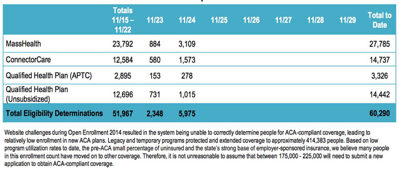 Well, it turns out I had it right in the first place: Massachusetts is about to announce 14,101 QHPs actually selected as of Saturday, out of 28,175 determinations (essentially 50% on the nose)!