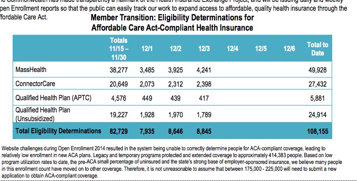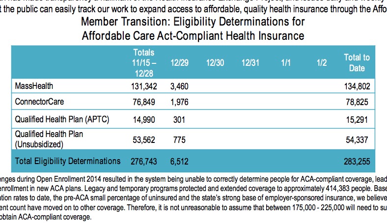 First, we have today's daily MA Health Connector Dashboard report, which states that there have been 148,453 QHP determinations thorugh yesterday (12/29). Assuming 50% of these have selected plans, that's around 74,200 QHP selections to date. In addition, the 134,803 Medicaid (MassHealth) enrollments are already locked in.