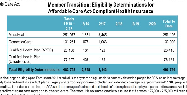On Friday, the MA Health Connector confirmed 134,000 QHP selections out of 237,000 people determined eligible for QHPs as of 2/18. Since then they've added another 6,614 QHP determinations.