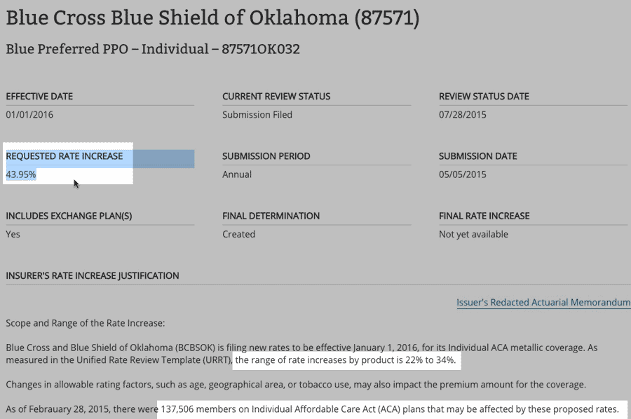 Now, there are two additional BCBSOK listings on the Rate Review site which do appear to be included in the first one (all 3 list the total "members affected" as exactly 137,506)...but the other two have 22.64% and 33.83% listed as the "official" requested rate increase, both of which are still well below 44%.