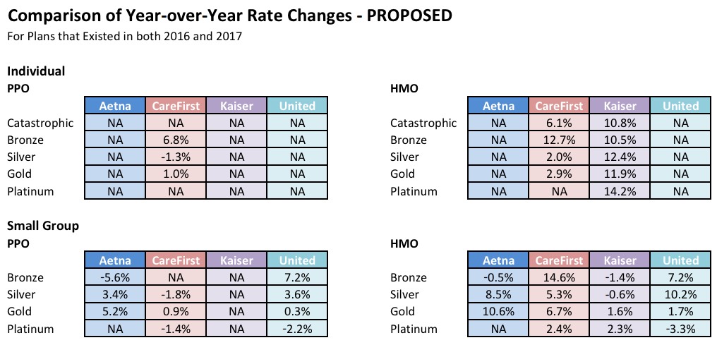 The good news about estimating the DC exchange rate hike requests is that the DC Dept. of Insurance, Securities & Banking is pretty transparent about posting this info, and they keep it simple. It's simpler still because like Vermont, DC requires that all individual and small group policies be sold on the exchange, so there's no off-exchange data to track down.
