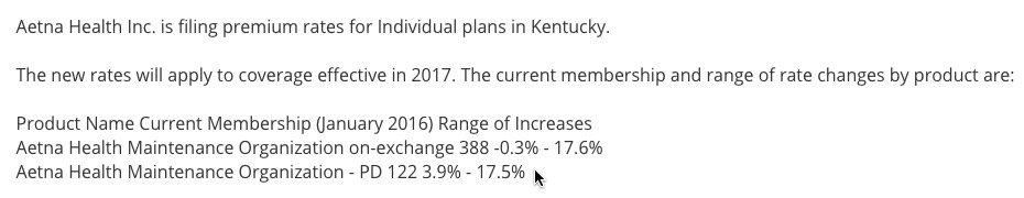 The good news is that I was able to track down the average rate change for all 6 carriers offering individual plans in Indiana (UnitedHealthcare is dropping out of the market, and I'm not sure what's going on with Aetna and Coordinated Care Corporation, both of which do have listings in Indiana's SERFF database for 2017...but neither of which has any actual filings listed. I presume these are placeholders for them to potentially enter the state market, which would be a good thing (and which Aetna has already indicated they might be doing next year). In addition, Golden Rule says that they'll be offering ACA-compliant policies starting next year as well (mainly for their current "transitional" enrollees).