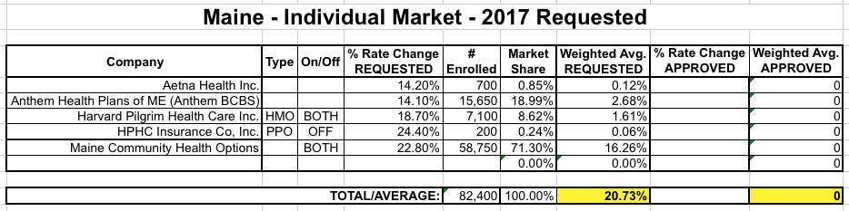 Some states make it next to impossible to track down this info. Others hand it to you on a silver plate. And then there are states like Oregon, who provide the average rate hike requests in a simple, easy format, but don't necessarily include the market share of those companies, making it difficult to compile a weighted average: