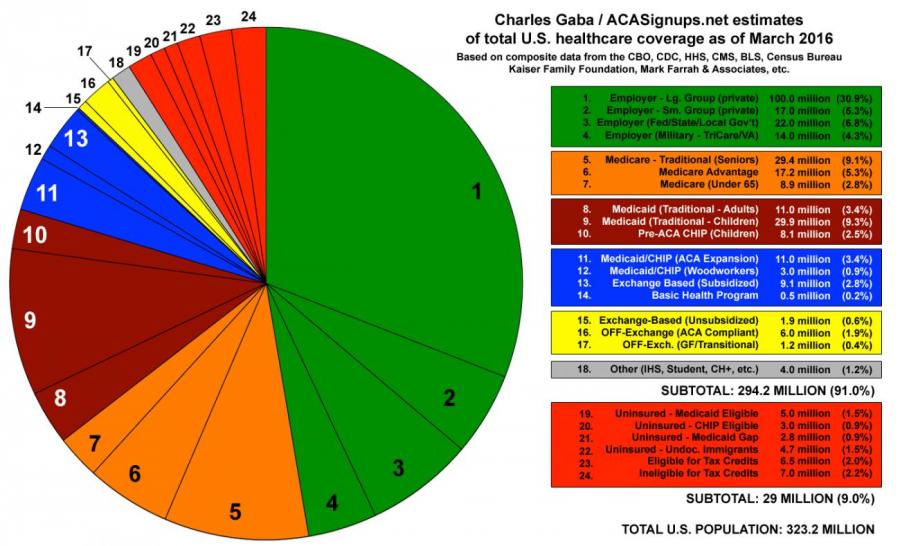 Last March I cobbled together this pie chart, which attempted to break out the health coverage status of every single person living in the United States (yes, including undocumented immigrants). It gained quite a bit of attention at the time from healthcare reporters, wonks and so forth. While my numbers may have been slightly fuzzy here and there, it received a general seal of approval from Larry Levitt of the Kaiser Family Foundation, who stated "Obviously some of the estimates are approximations, but I don't see any glaring problems."