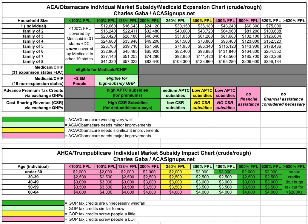 Back in January, being a spreadsheet guy but not being a particularly good graphic artist, I put together a crude table which attempted to give a general idea of which groups of people the Affordable Care Act is, in general, working out for fairly well vs. which groups the ACA isn't working for, by income threshold. A couple of days ago, with details about the GOP's "replacement plan" popping up all over, I posted a similar version of the table which tried to compare the winners/losers between the two plans, and the contrast was remarkable: Nearly a complete reversal.