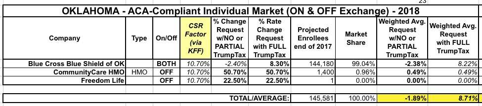 Well, that certainly seems to have done the trick: This year BCBSOK (still the only on-exchange player and holding over 99% of the market anyway) is requesting a (relatively) modest 8.3% average rate increase...and their filing specifically calls out both the CSR and mandate enforcement factors as being major reasons. Assuming the Kaiser Family Foundation's estimates are accurate, that means that if the CSR payments were guaranteed for 2018, BCBSOK should actually be lowering their rates slightly, to the tune of around 2.4%.