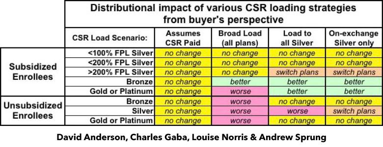A few spread the extra CSR load across all policies, both on and off the exchange. This seems like the "fairest" way of handling things on the surface, but is actually the worst way to do so, because it hurts all unsubsidized enrollees no matter what they choose for 2018 and can even make things slightly worse for some subsidized enrollees in Gold or Platinum plans.