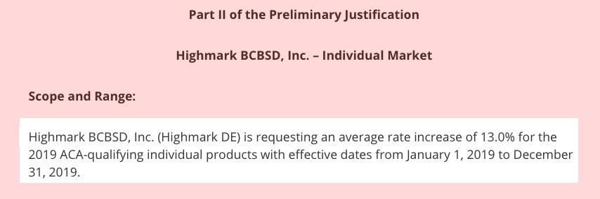 Delaware is pretty cut & dried: There's only one carrier, Highmark, offering ACA policies in the state. They're requesting a 13.0% average rate increase for 2019, and yes, they call out both the individual mandate being repealed and #ShortAssPlans being expanded by Trump and the GOP.