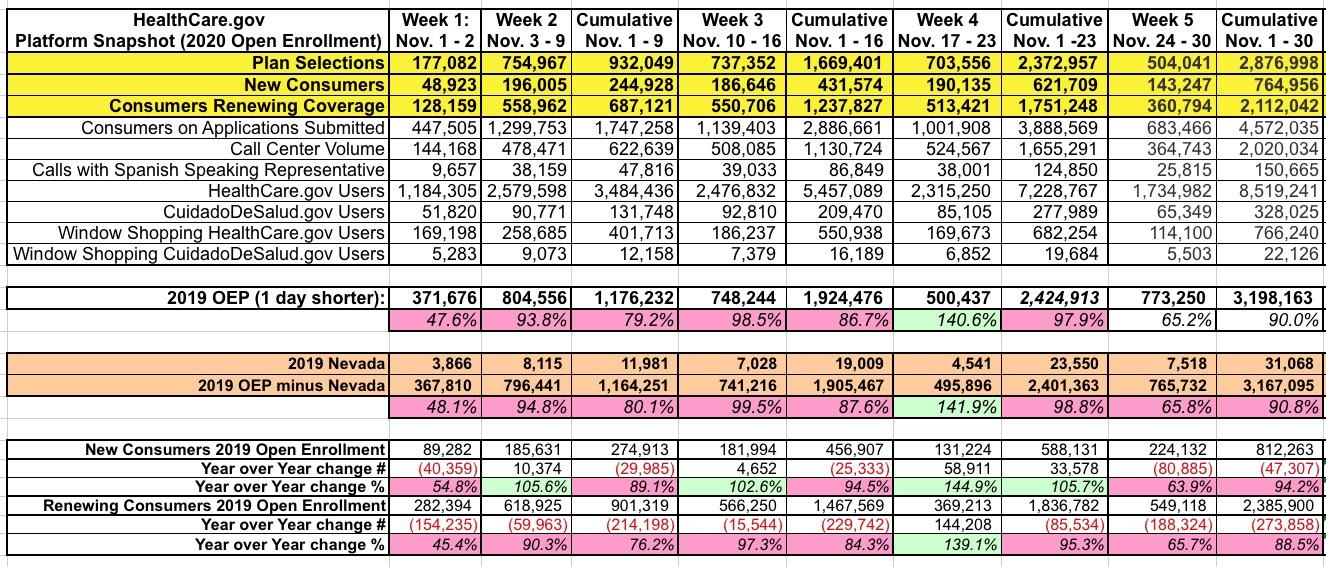 Having said that, with the Week 7 HC.gov Snapshot Report being released earlier this afternoon, this is a good time to pause and take a look at how the 2020 Open Enrollment Period is shaping up. Remember, even HC.gov's total will change slightly when the dust settles...they're still missing the final 3 hours of the extended Open Enrollment Period (I'm guessing perhaps 30,000 more?), plus an unknown number of "callbacks" to people who were unable to get through on 12/15 but left their contact information (perhaps another few thousand?).