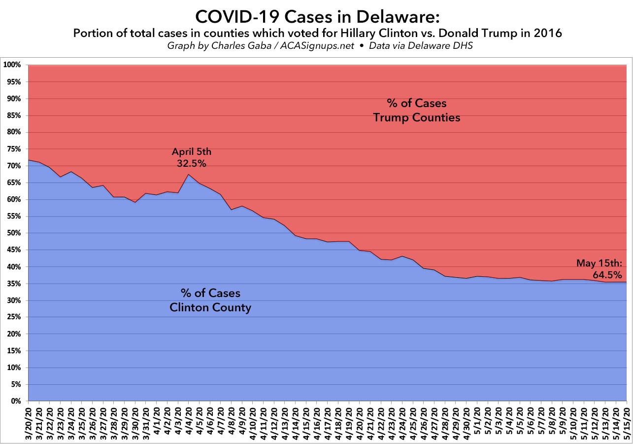 Believe it or not, even though Delaware is a fairly solidly blue state in Presidential elections, two of the three counties there (it's pretty small) voted for Donald Trump in 2016. Here's how the state's cases have shifted over time between New Castle County (the largest of the three, which voted for Clinton) and the other two counties which voted for Trump:
