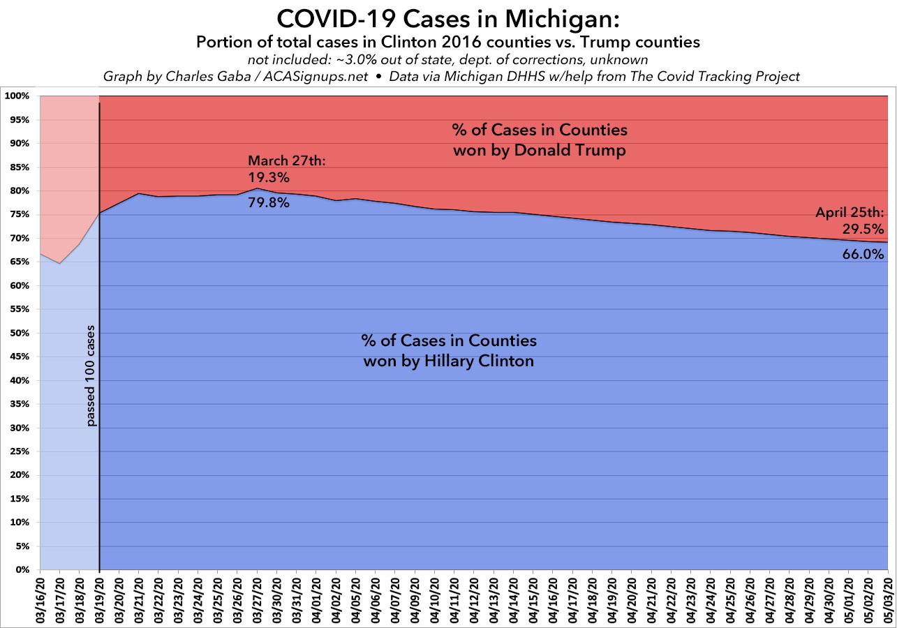 A few weeks ago, I posted a detailed analysis of how the COVID-19 virus has been spreading throughout my home state of Michigan. I noted that while the outbreak originally spread quickly in Detroit and the more densely-populated Metropolitan Detroit region (Wayne, Oakland and Macomb counties), that has gradually changed over time, with the virus spreading to the rest of the state--including rural, conservative-leaning areas--at a faster rate while it slowed down in the urban areas.