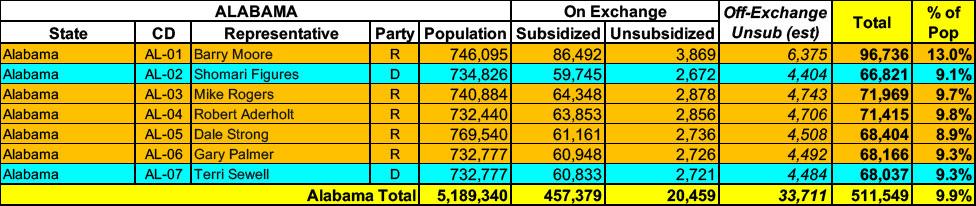 Alabama has around 477,000 residents enrolled in ACA exchange plans, 96% of whom are currently subsidized. I estimate they also have perhaps another ~33,000 unsubsidized off-exchange enrollees.