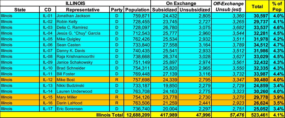 Illinois has around ~466,000 residents enrolled in ACA exchange plans, 90% of whom are currently subsidized. I estimate they also have another ~57,000 unsubsidized off-exchange enrollees.