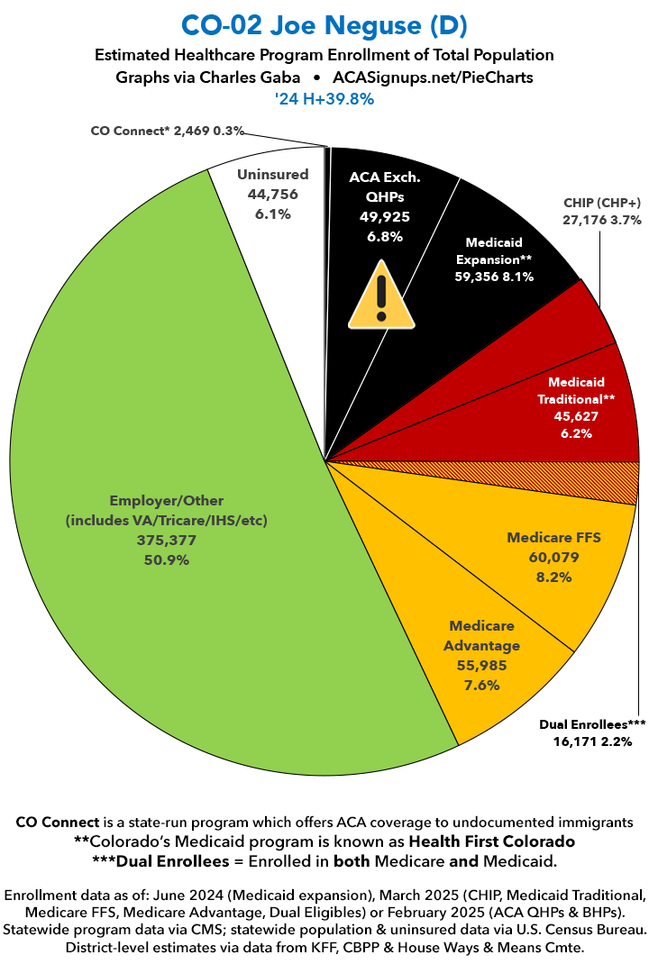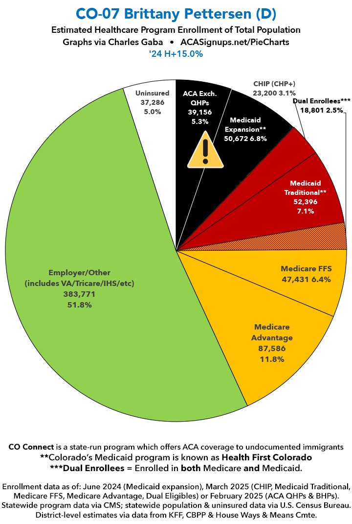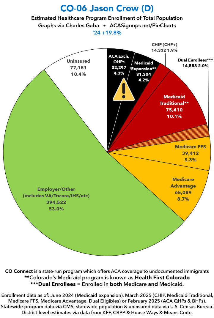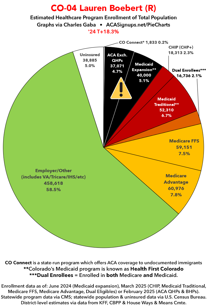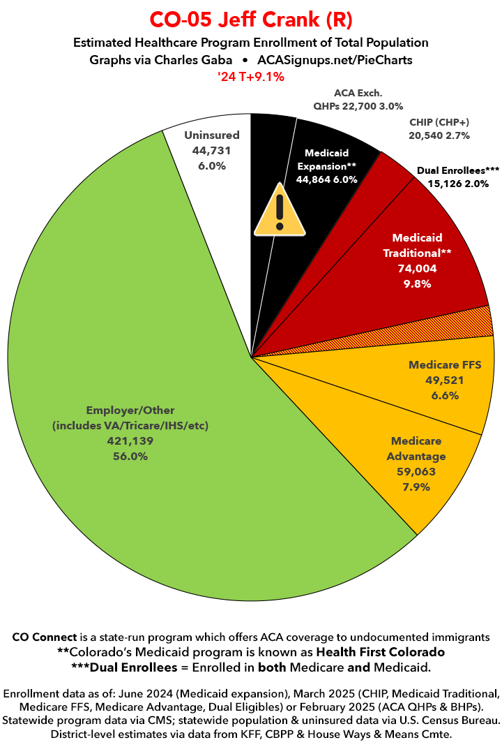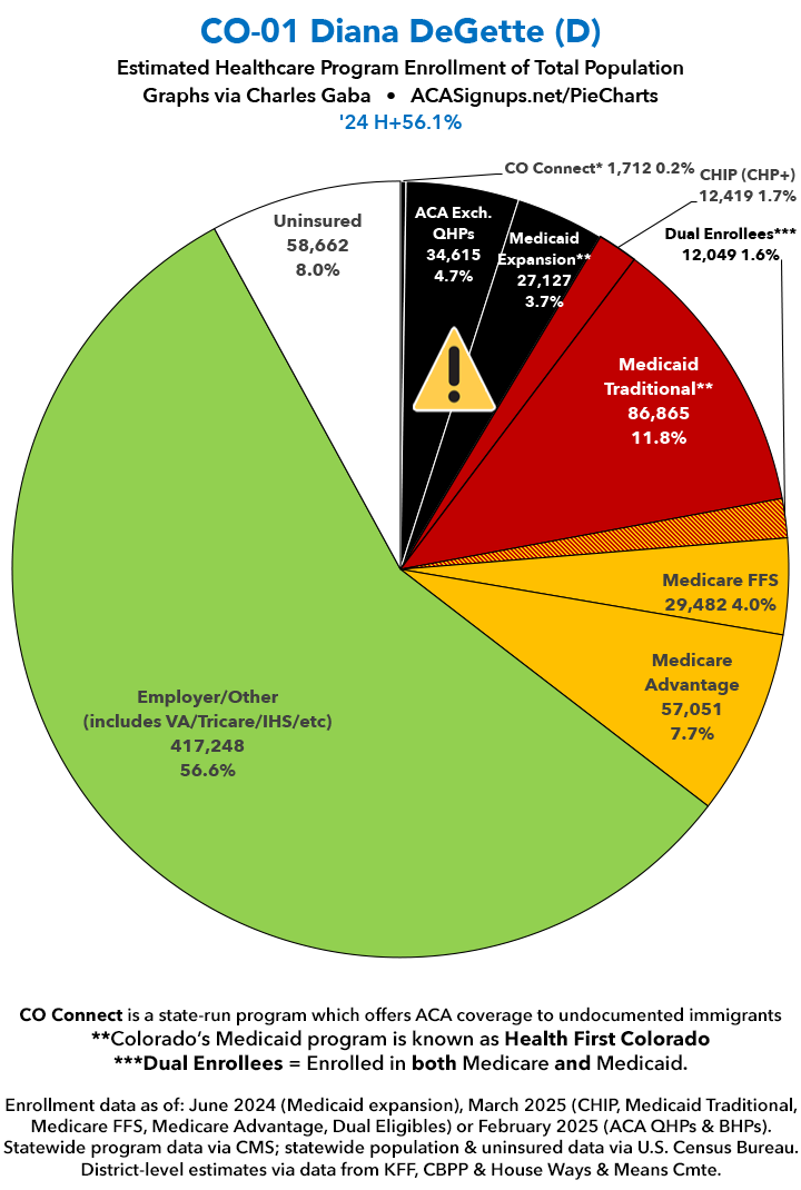UPDATE 7/2/25: I've updated the web versions of the graphics with the most up-to-date enrollment data I have access to. The black sections w/the ⚠️ symbol are those most at risk of losing healthcare coverage due to H.R. 1, the "One Big Beautiful Bill Act" (aka the #MAGAMurderBill).