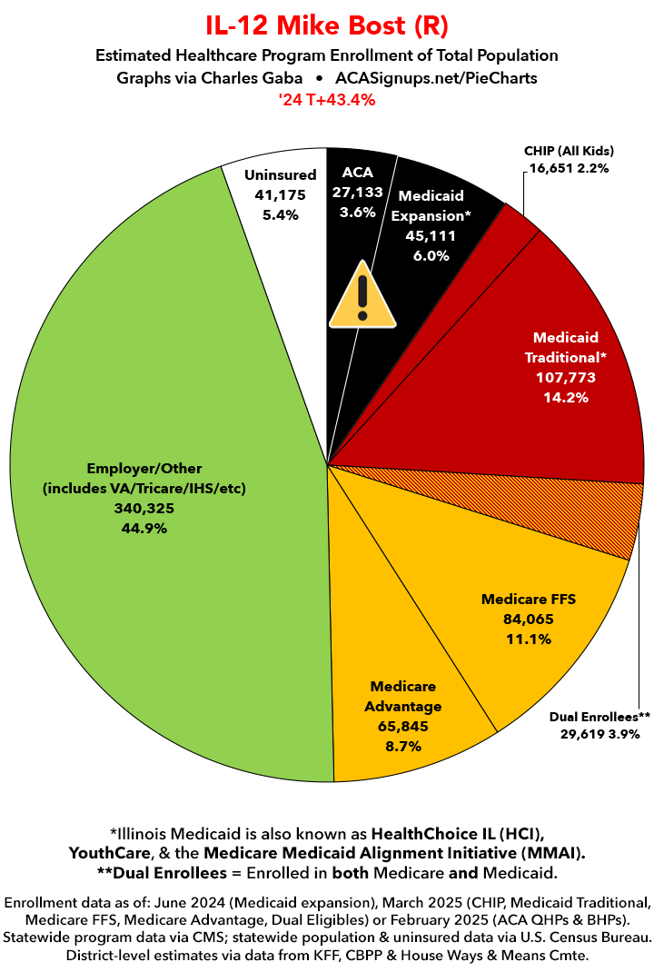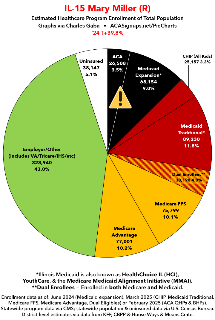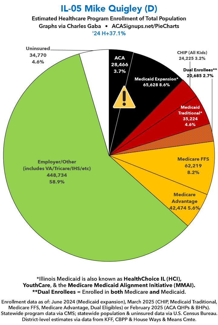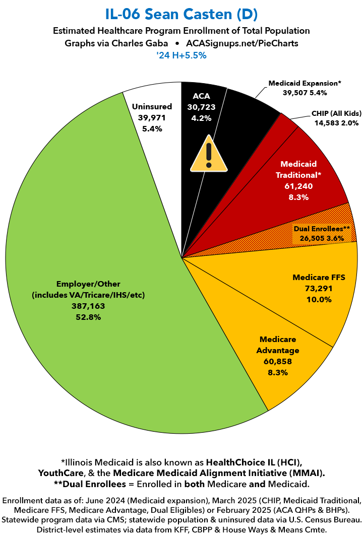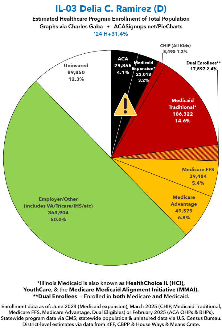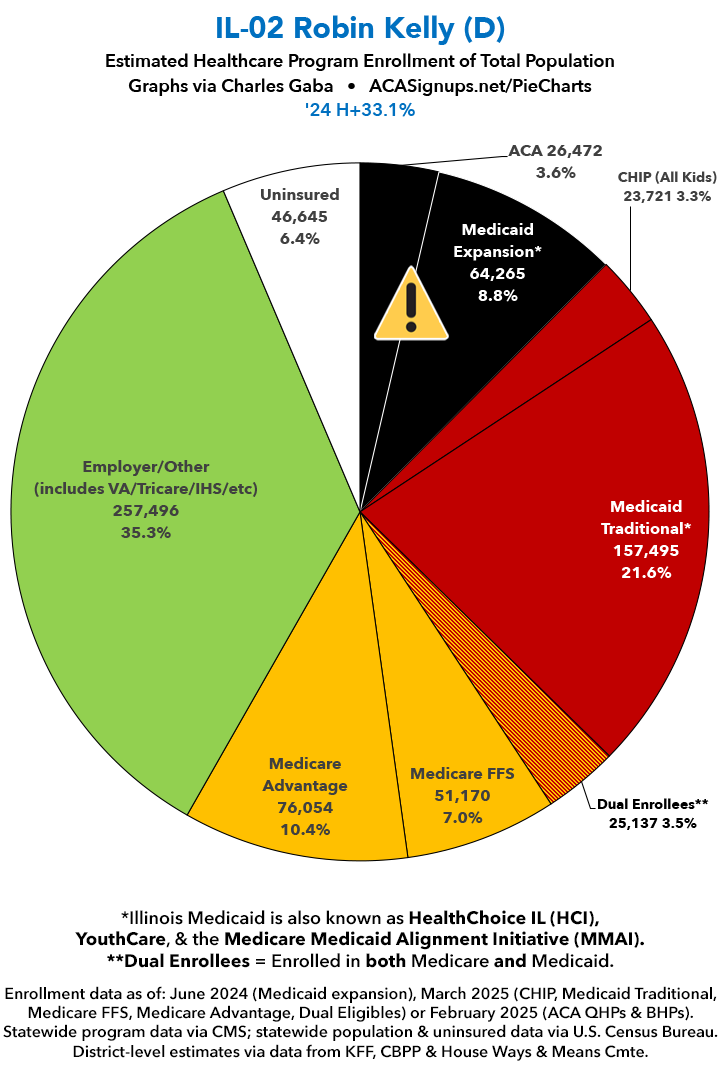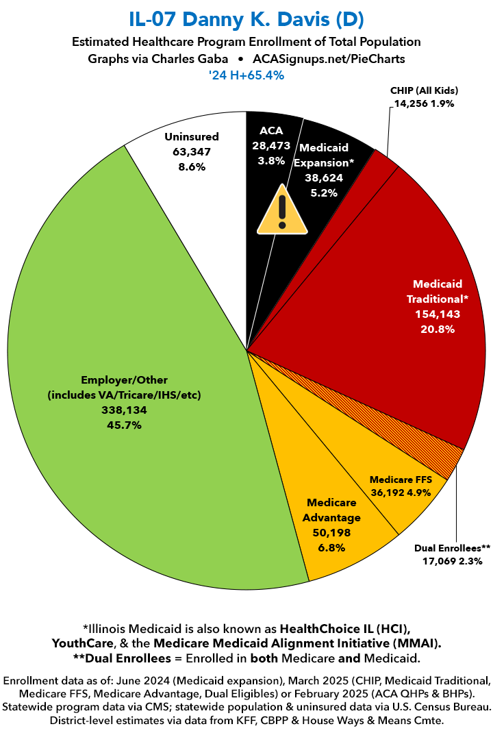 UPDATE 7/3/25: I've updated the web versions of the graphics with the most up-to-date enrollment data I have access to. The black sections w/the ⚠️ symbol are those most at risk of losing healthcare coverage due to H.R. 1, the "One Big Beautiful Bill Act" (aka the #MAGAMurderBill).