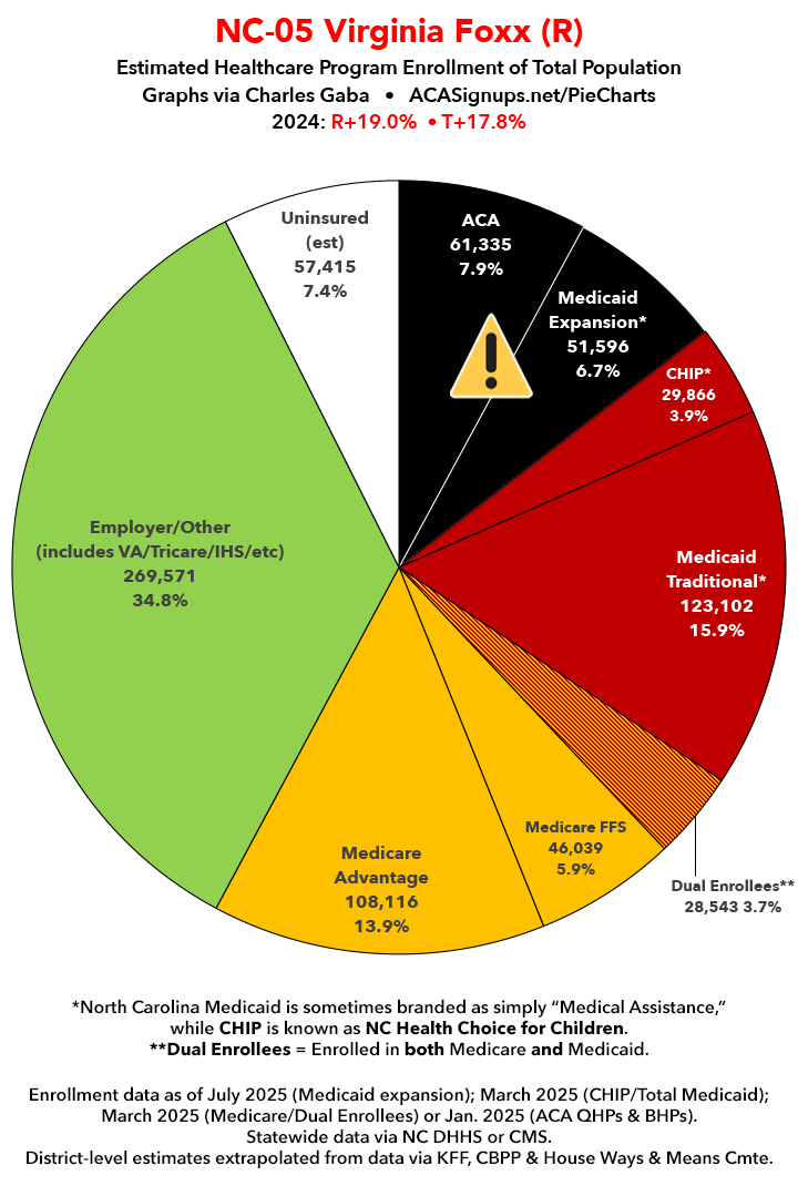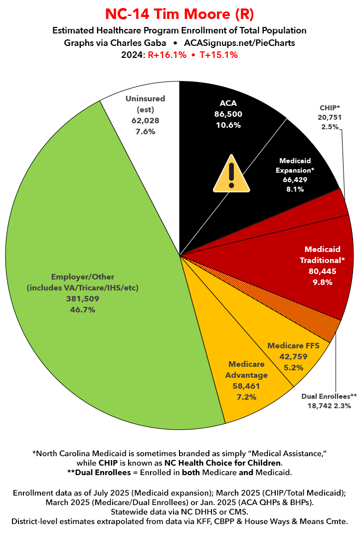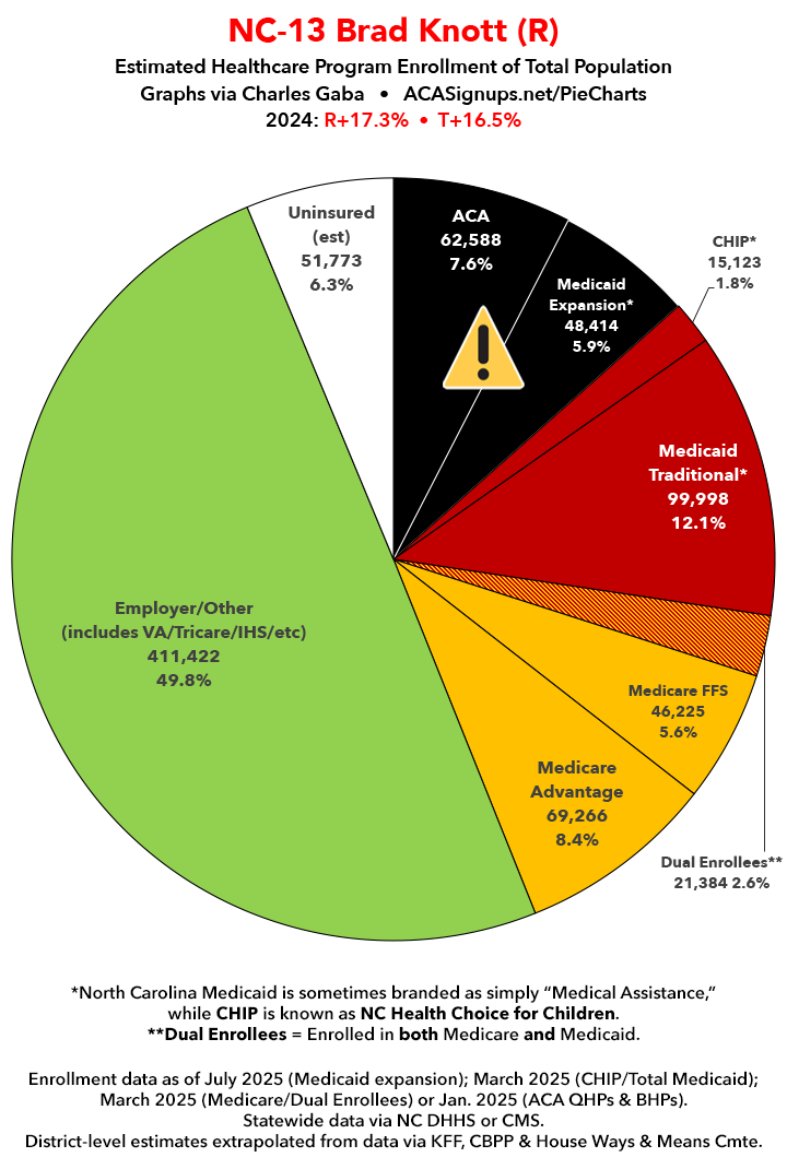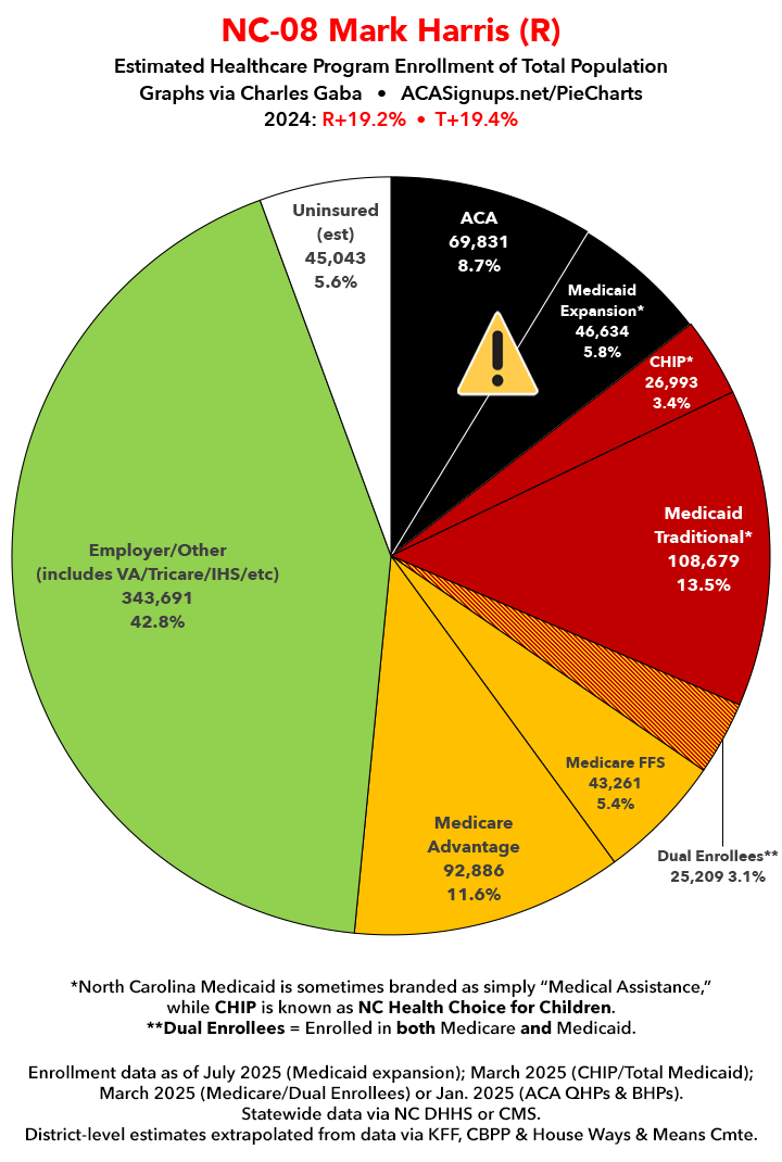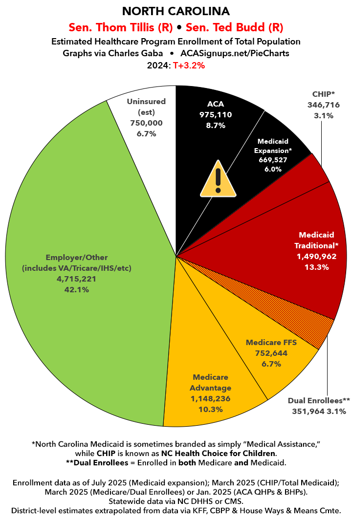 UPDATE 7/9/25: I've updated the web versions of the graphics with the most up-to-date enrollment data I have access to. The black sections w/the ⚠️ symbol are those most at risk of losing healthcare coverage due to H.R. 1, the "One Big Beautiful Bill Act" (aka the #MAGAMurderBill).