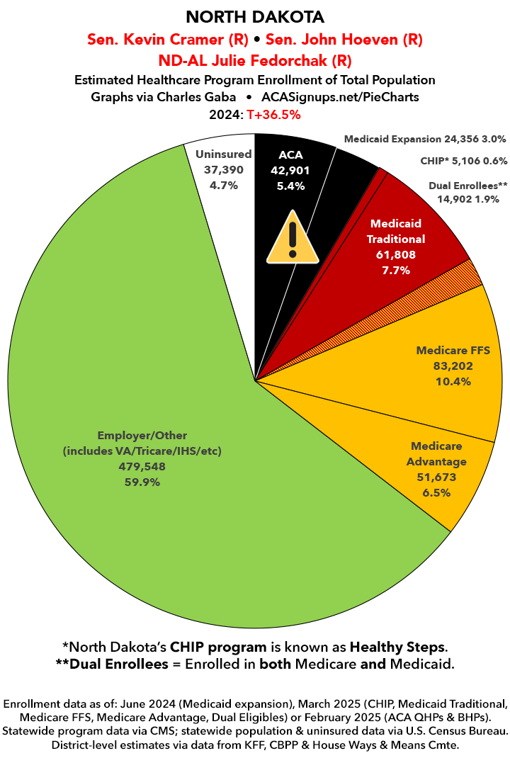 UPDATE 7/9/25: I've updated the web versions of the graphics with the most up-to-date enrollment data I have access to. The black sections w/the ⚠️ symbol are those most at risk of losing healthcare coverage due to H.R. 1, the "One Big Beautiful Bill Act" (aka the #MAGAMurderBill).