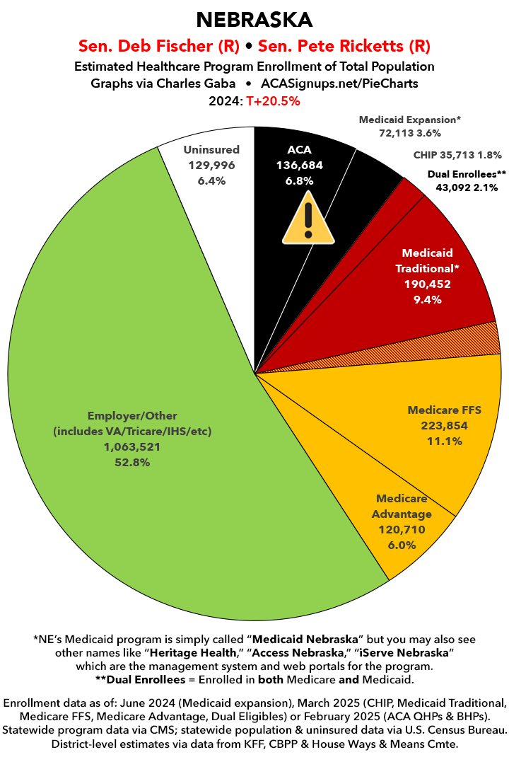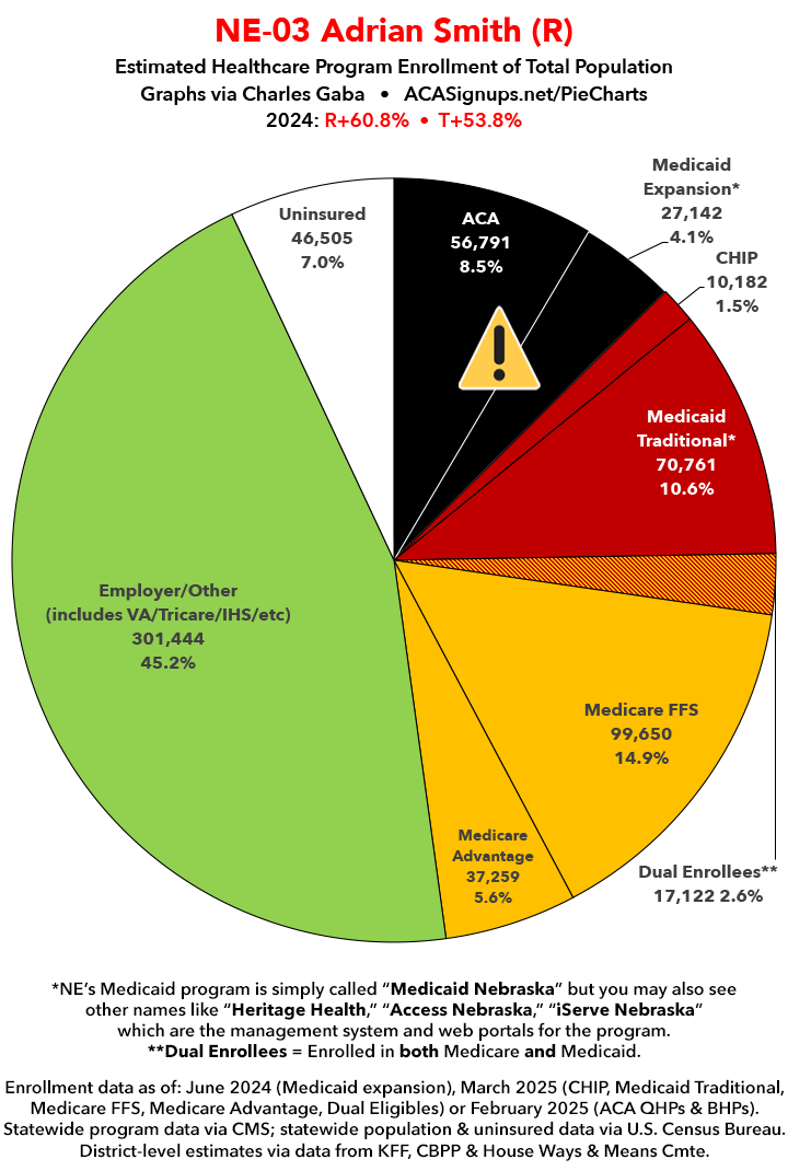 UPDATE 7/6/25: I've updated the web versions of the graphics with the most up-to-date enrollment data I have access to. The black sections w/the ⚠️ symbol are those most at risk of losing healthcare coverage due to H.R. 1, the "One Big Beautiful Bill Act" (aka the #MAGAMurderBill).