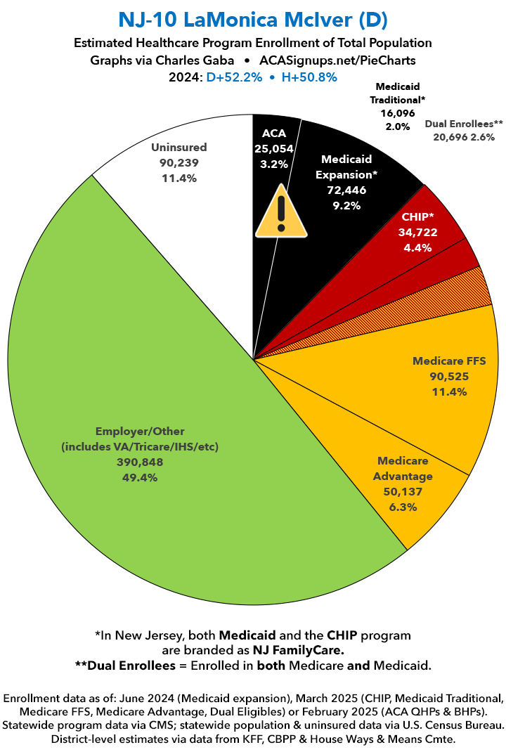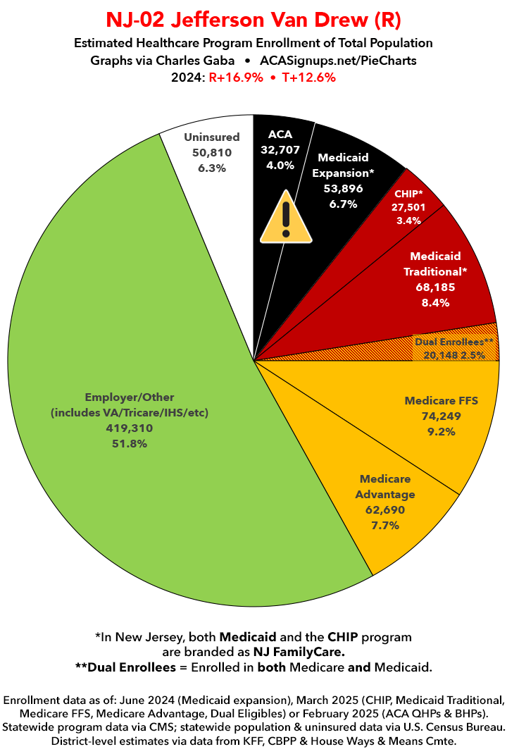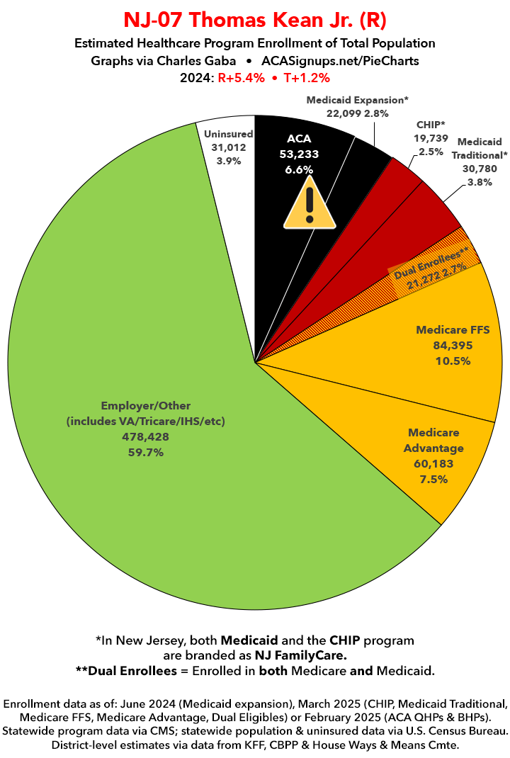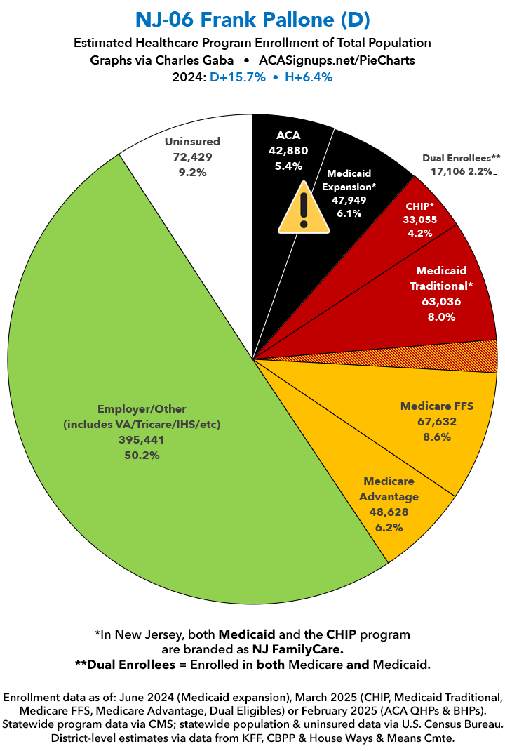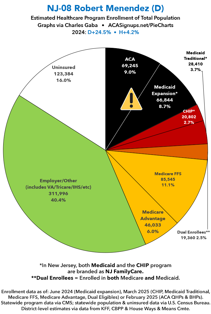UPDATE 7/8/25: I've updated the web versions of the graphics with the most up-to-date enrollment data I have access to. The black sections w/the ⚠️ symbol are those most at risk of losing healthcare coverage due to H.R. 1, the "One Big Beautiful Bill Act" (aka the #MAGAMurderBill).