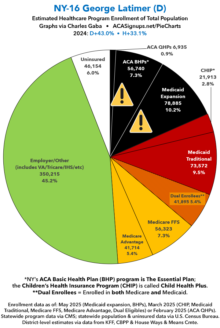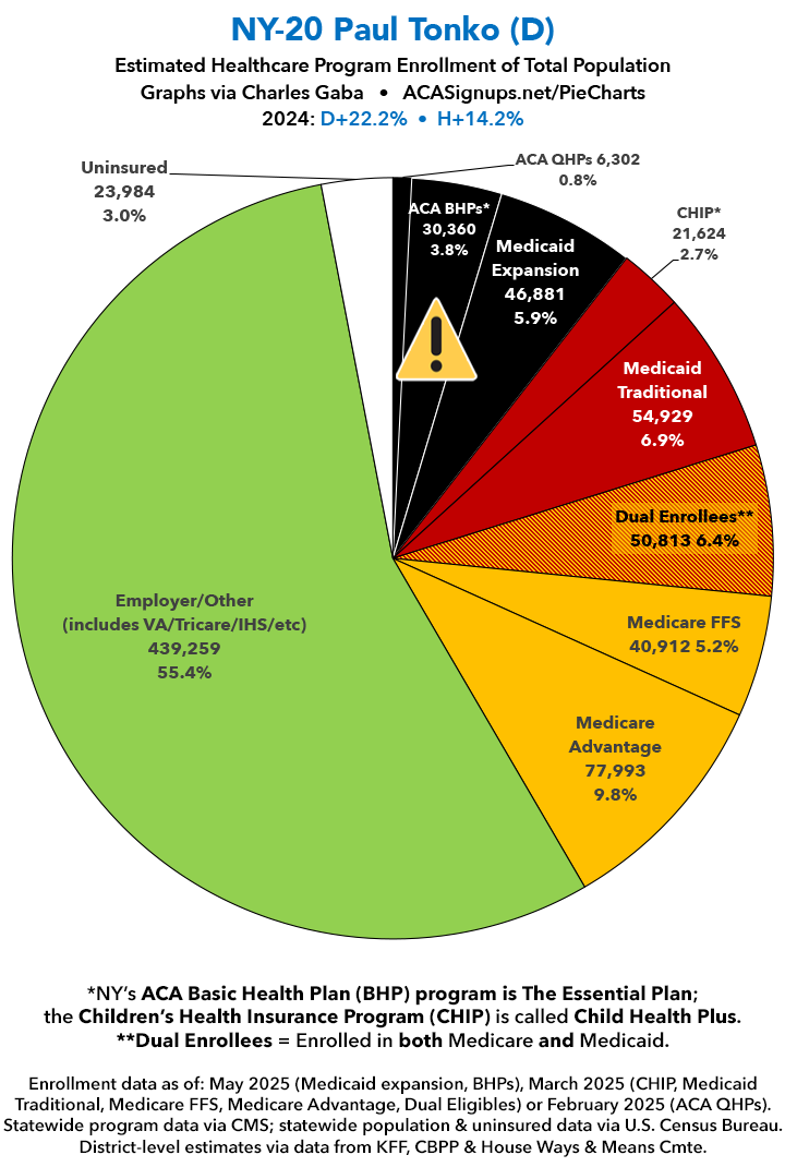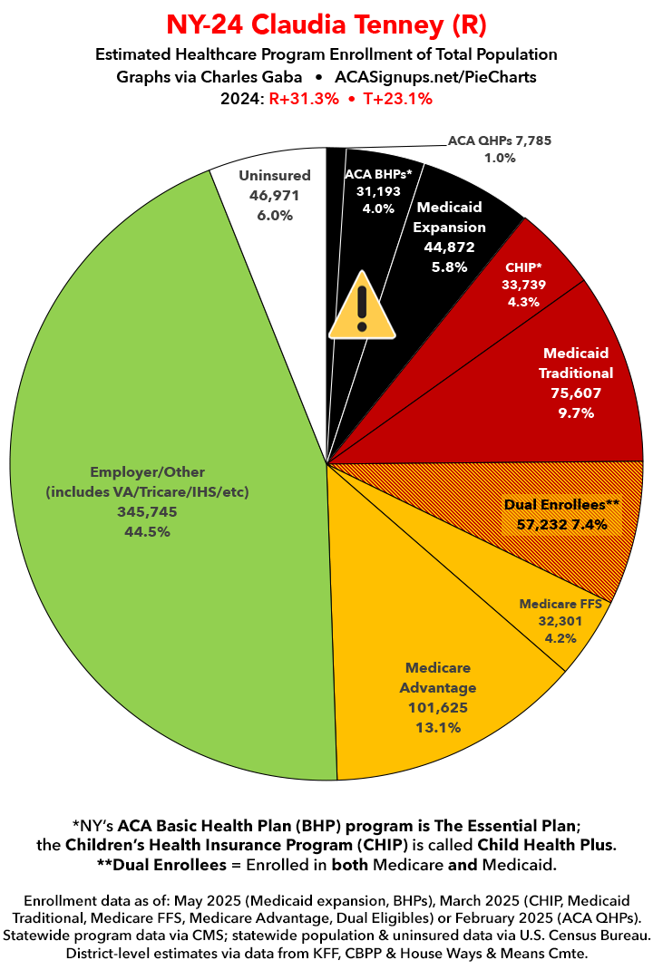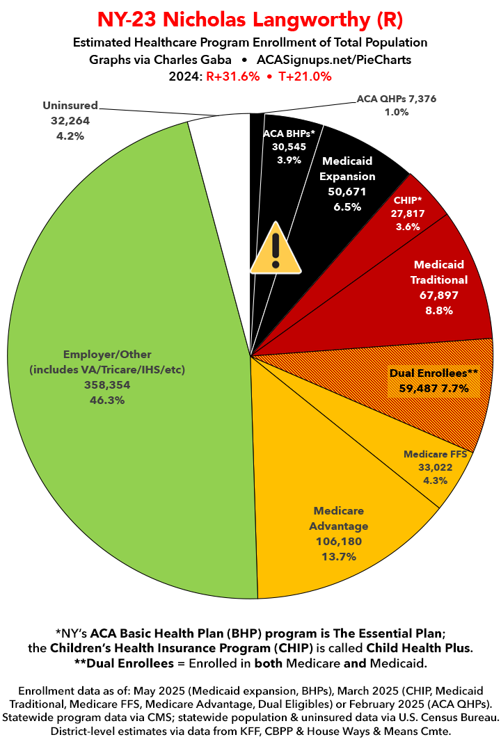 UPDATE 7/9/25: I've updated the web versions of the graphics with the most up-to-date enrollment data I have access to. The black sections w/the ⚠️ symbol are those most at risk of losing healthcare coverage due to H.R. 1, the "One Big Beautiful Bill Act" (aka the #MAGAMurderBill).
