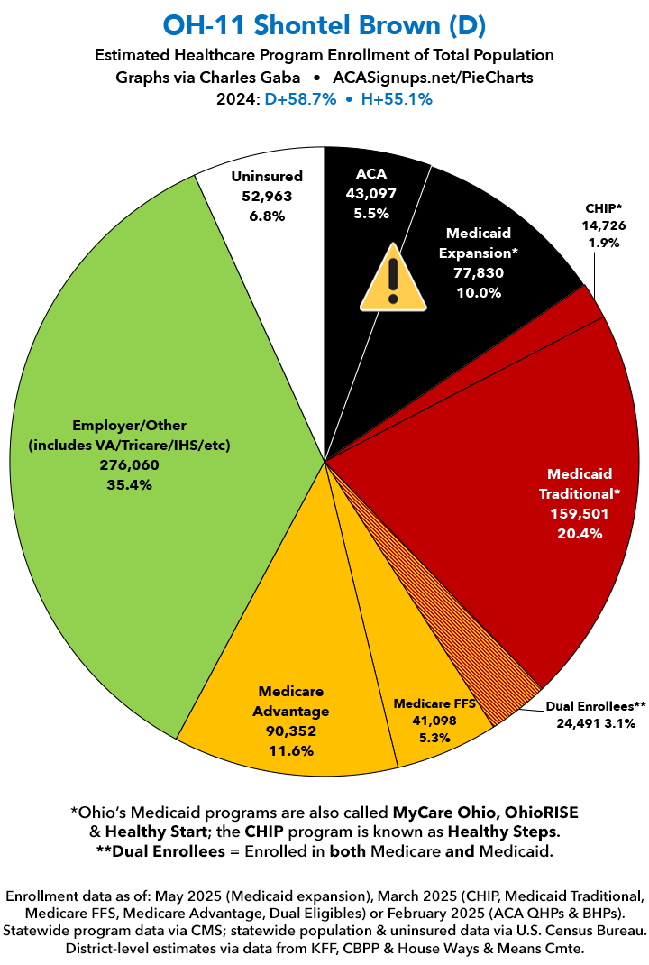 UPDATE 7/10/25: I've updated the web versions of the graphics with the most up-to-date enrollment data I have access to. The black sections w/the ⚠️ symbol are those most at risk of losing healthcare coverage due to H.R. 1, the "One Big Beautiful Bill Act" (aka the #MAGAMurderBill).