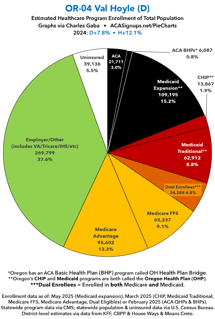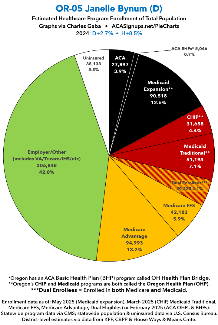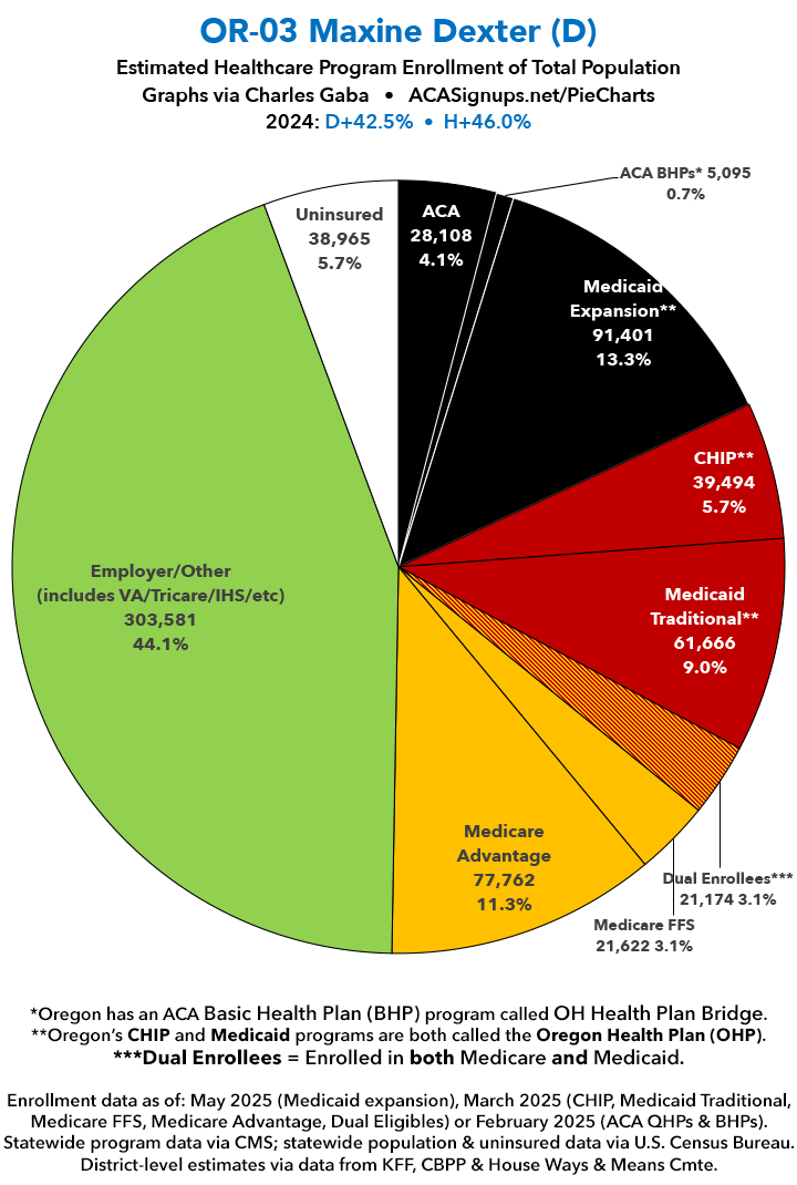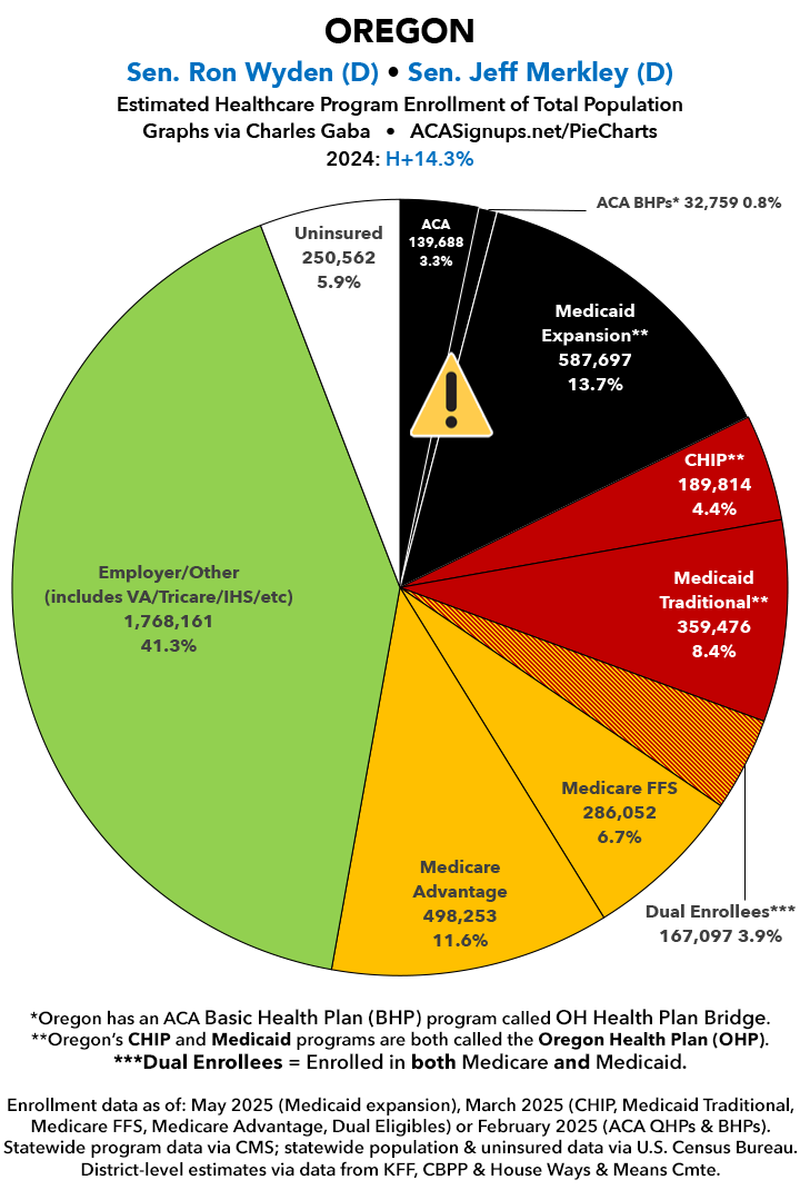 UPDATE 7/10/25: I've updated the web versions of the graphics with the most up-to-date enrollment data I have access to. The black sections w/the ⚠️ symbol are those most at risk of losing healthcare coverage due to H.R. 1, the "One Big Beautiful Bill Act" (aka the #MAGAMurderBill).