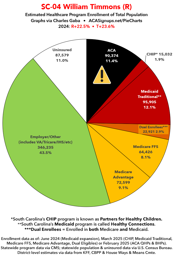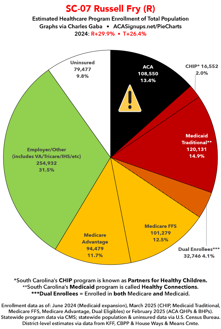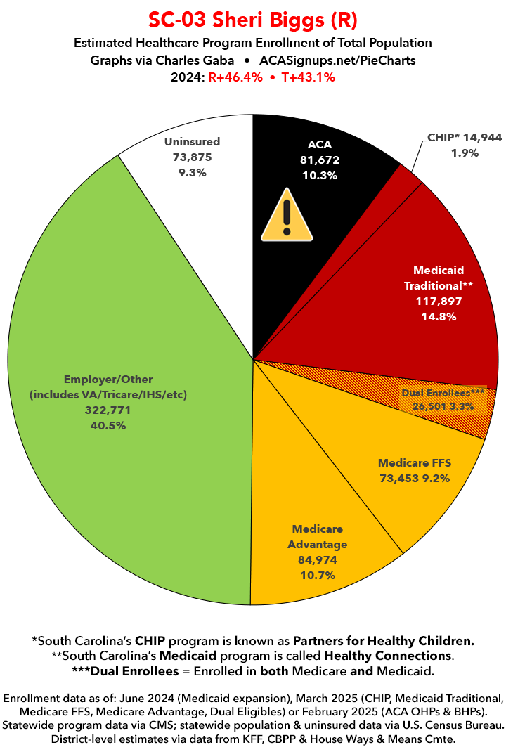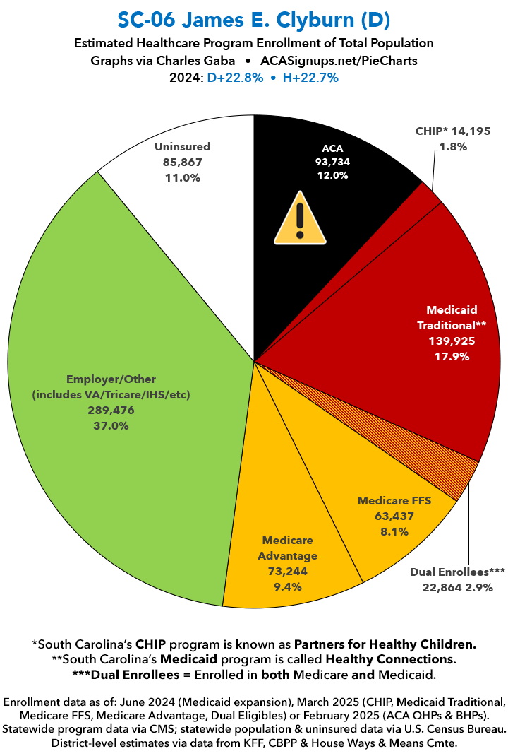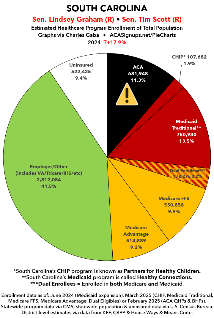 UPDATE 7/11/25: I've updated the web versions of the graphics with the most up-to-date enrollment data I have access to. The black sections w/the ⚠️ symbol are those most at risk of losing healthcare coverage due to H.R. 1, the "One Big Beautiful Bill Act" (aka the #MAGAMurderBill).