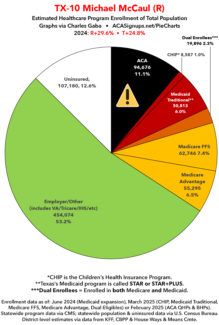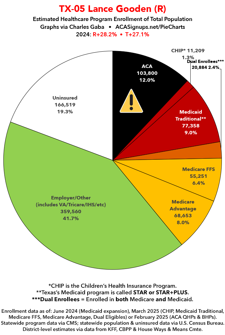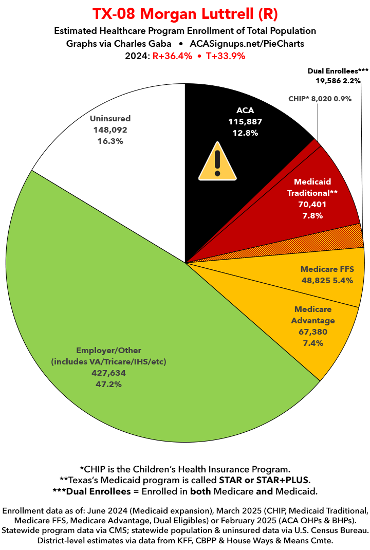 UPDATE 7/13/25: I've updated the web versions of the graphics with the most up-to-date enrollment data I have access to. The black sections w/the ⚠️ symbol are those most at risk of losing healthcare coverage due to H.R. 1, the "One Big Beautiful Bill Act" (aka the #MAGAMurderBill).