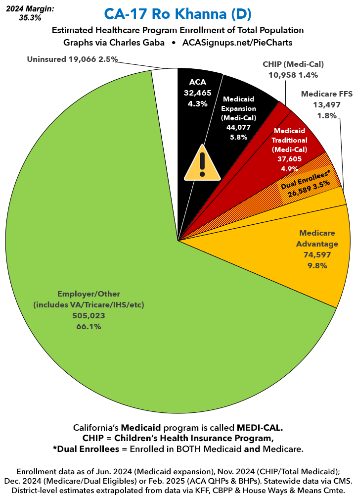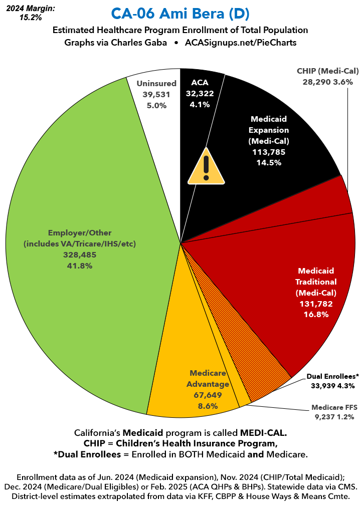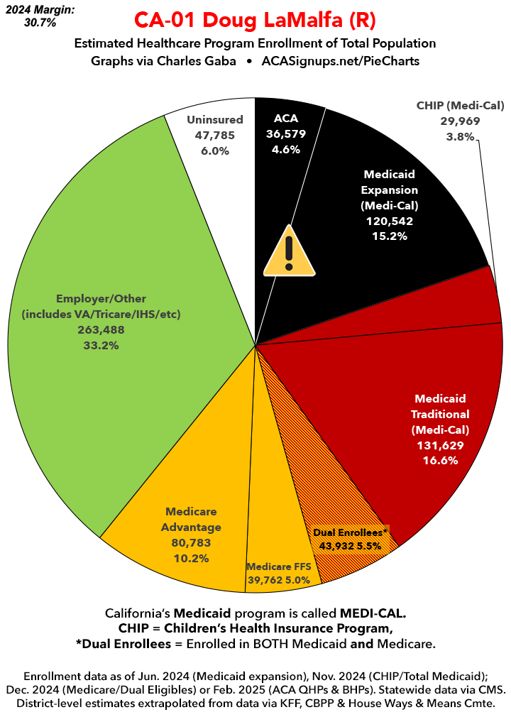 With the pending dire threat to several of these programs (primarily Medicaid & the ACA) from the House Republican Budget Proposal which recently passed, I'm going a step further and am generating pie charts which visualize just how much of every Congressional District's total population is at risk of losing healthcare coverage.